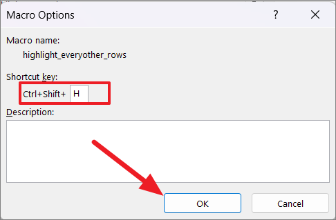 In the Macro Option, set your desired shortcut key under the ‘Shortcut Key:’ section for this macro. Then, click ‘OK’.