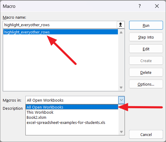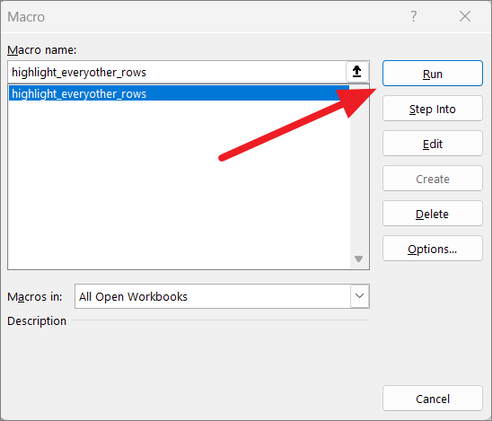 This will open the Macro dialog box. Select the macro for highlighting alternate rows from the box. Then, from the ‘Macros in:’ drop-down, choose whether you want to run this macro in ‘All Open Workbooks’, only ‘This Workbook’, or a specific workbook. Here, we are selecting ‘All Open Workbooks’.