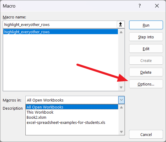 To do this, click the ‘Options…’ button in the Macro dialog box.