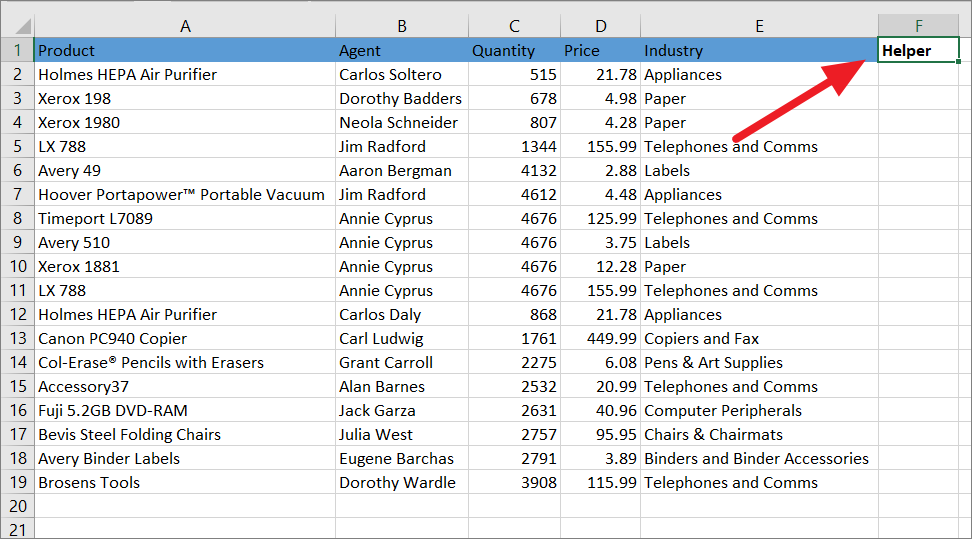 First, create a helper column right next to the data set (either to the left or right side of the table).