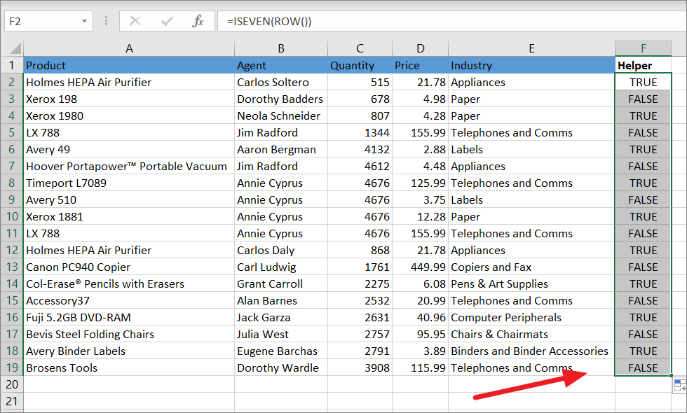 After highlighting the alternate rows, select the Helper column and delete the entire column.