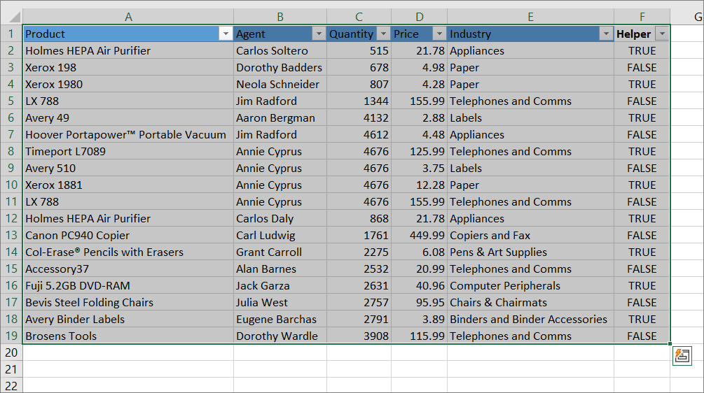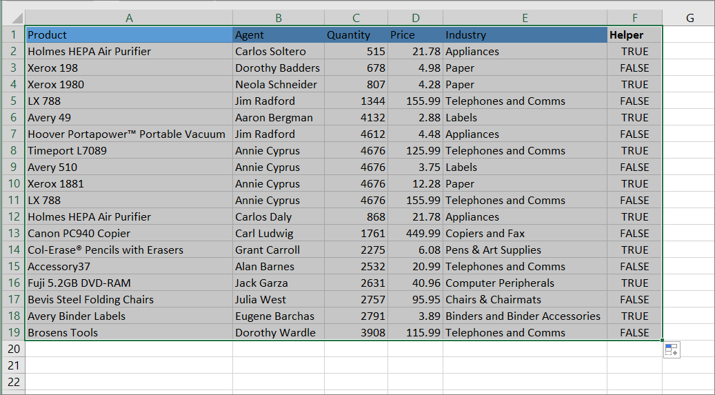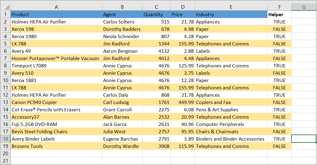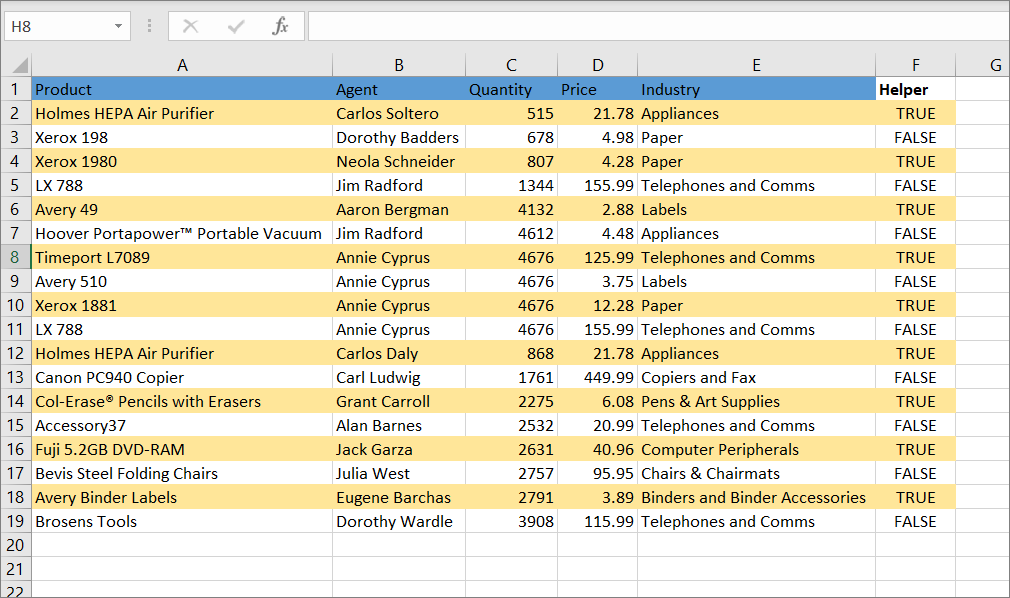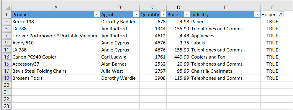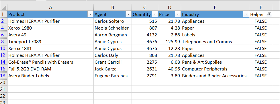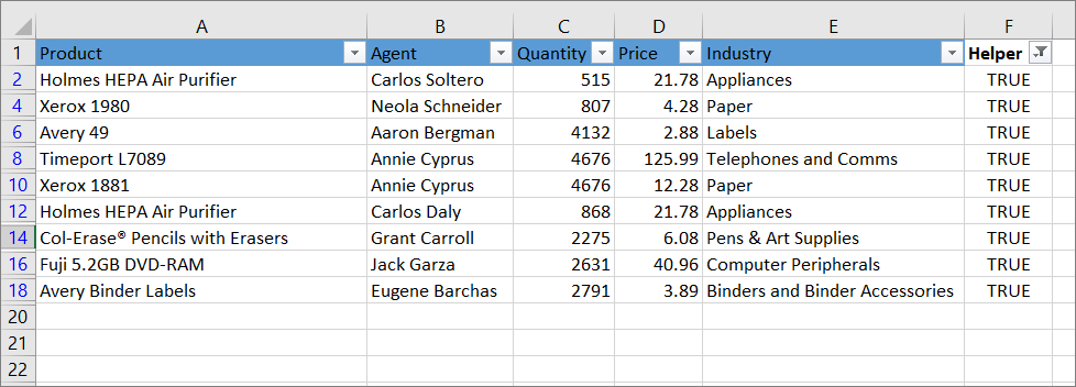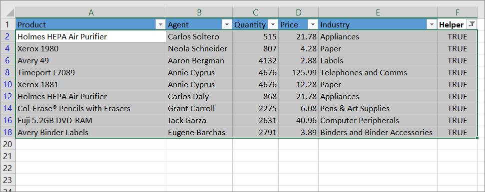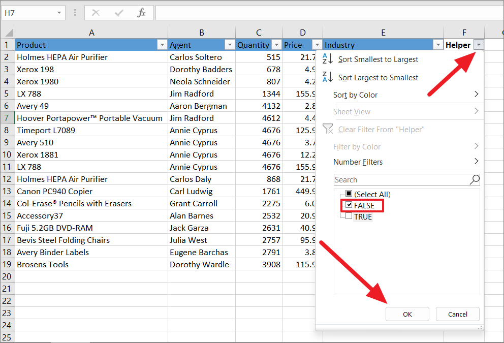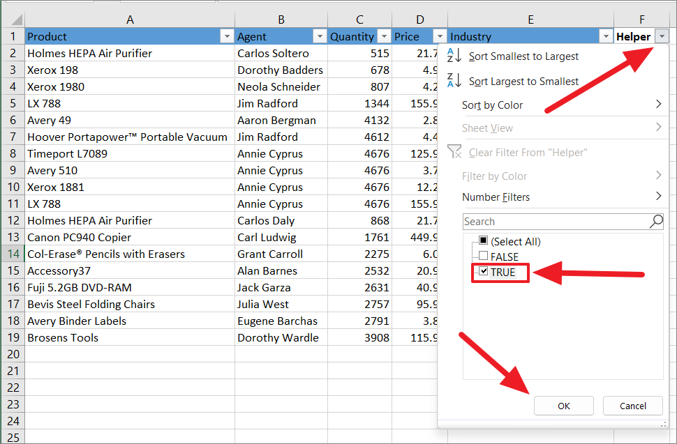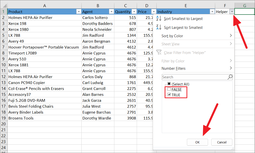 Now, all the column values will be filtered by the TRUE value. Then, click the filter button (little arrow button) in the helper column and check the TRUE option and uncheck the FALSE option in the filter options.