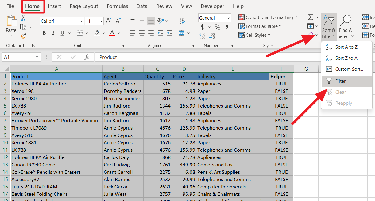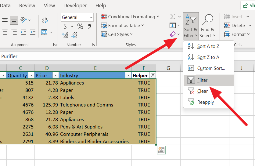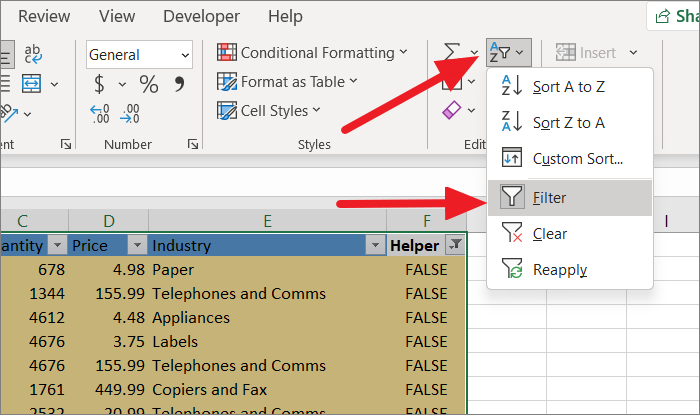 Next, click anywhere in the table or select the entire table, click the ‘Sort & Filter’ button again and click the ‘Filter’ option to remove the filtering.