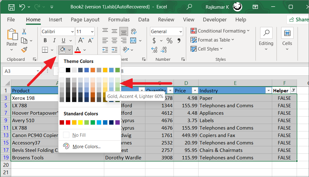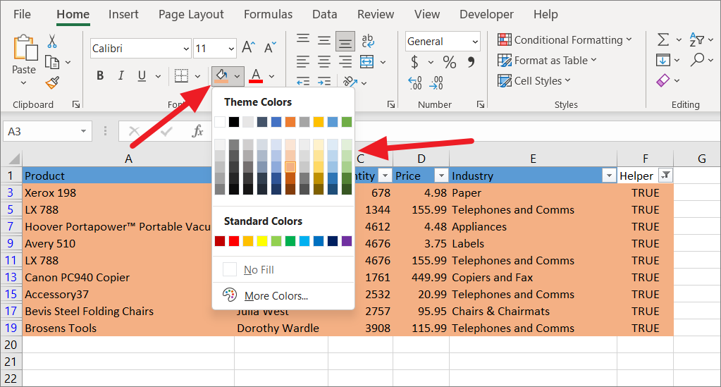 After selecting all the rows, go to the ‘Home’ tab and click the arrow next to the ‘Fill Color’ button (paint bucket icon) in the Font Group. From the drop-down menu, choose the color of your choice.