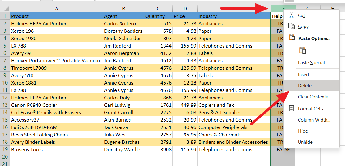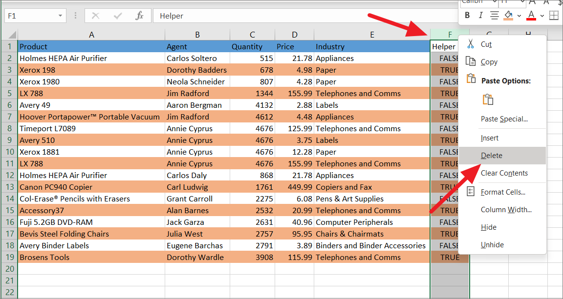 Then, select the whole helper column by clicking the column letter (F) and then right-click and select ‘Delete’ to delete it.