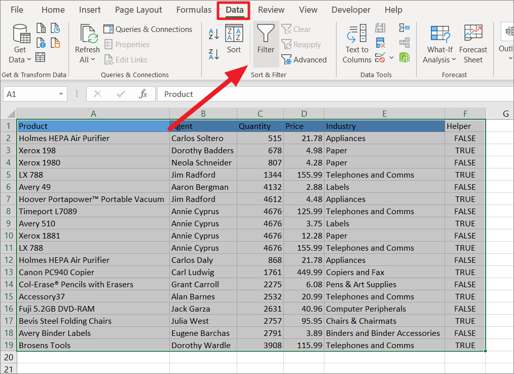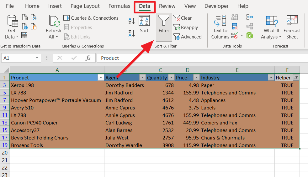 After that, select the whole table and remove the filtering by switching to the ‘Data’ tab and clicking the ‘Filter’ button or by pressing Ctrl+Shift+L.