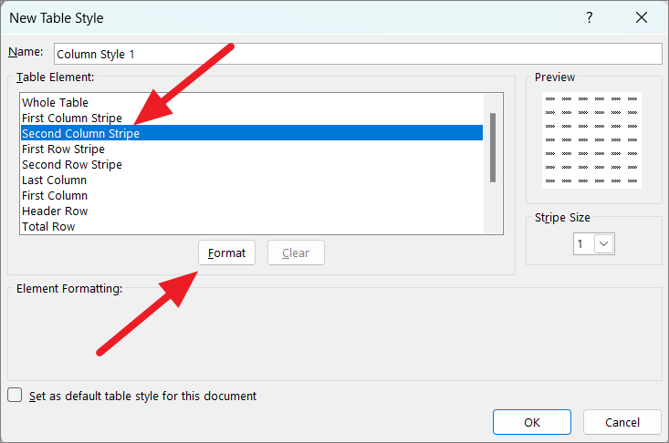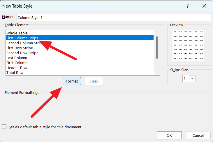 To highlight every other column starting from the first column (column A) of the table (A, C, E, etc.), select the ‘First column Stripe’ element and click ‘Format’.