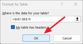 Then, confirm the range in the Format As Table box and click ‘OK’.
