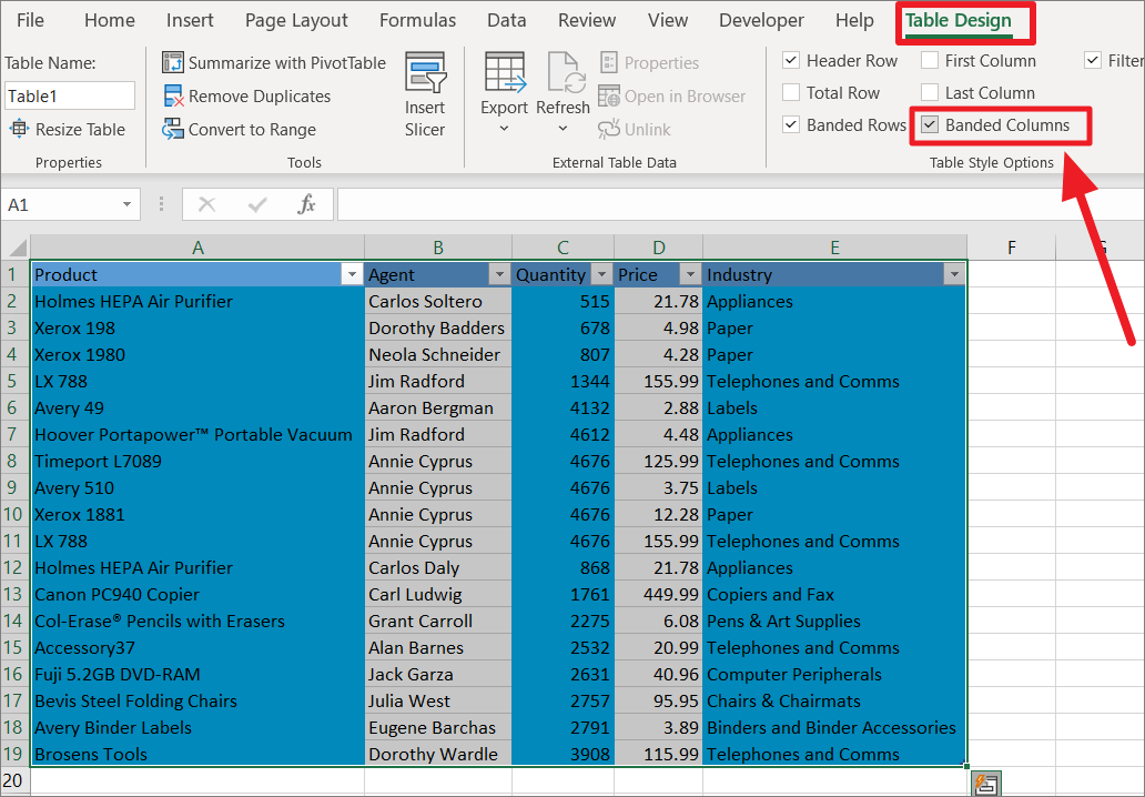If you still don’t see your alternate columns highlighted, select any cell in the table, and go to the ‘Table Design’ or ‘Design’ tab. And make sure that the ‘Banded Columns’ checkbox in the Table Style Options is checked.