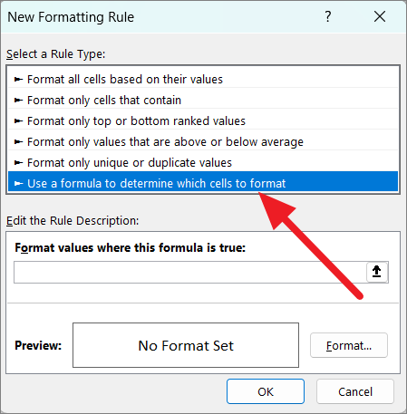 In the New Formatting Rule window, select ‘Use a formula to determine which cells to format’ from the Select a Rule Type: section.