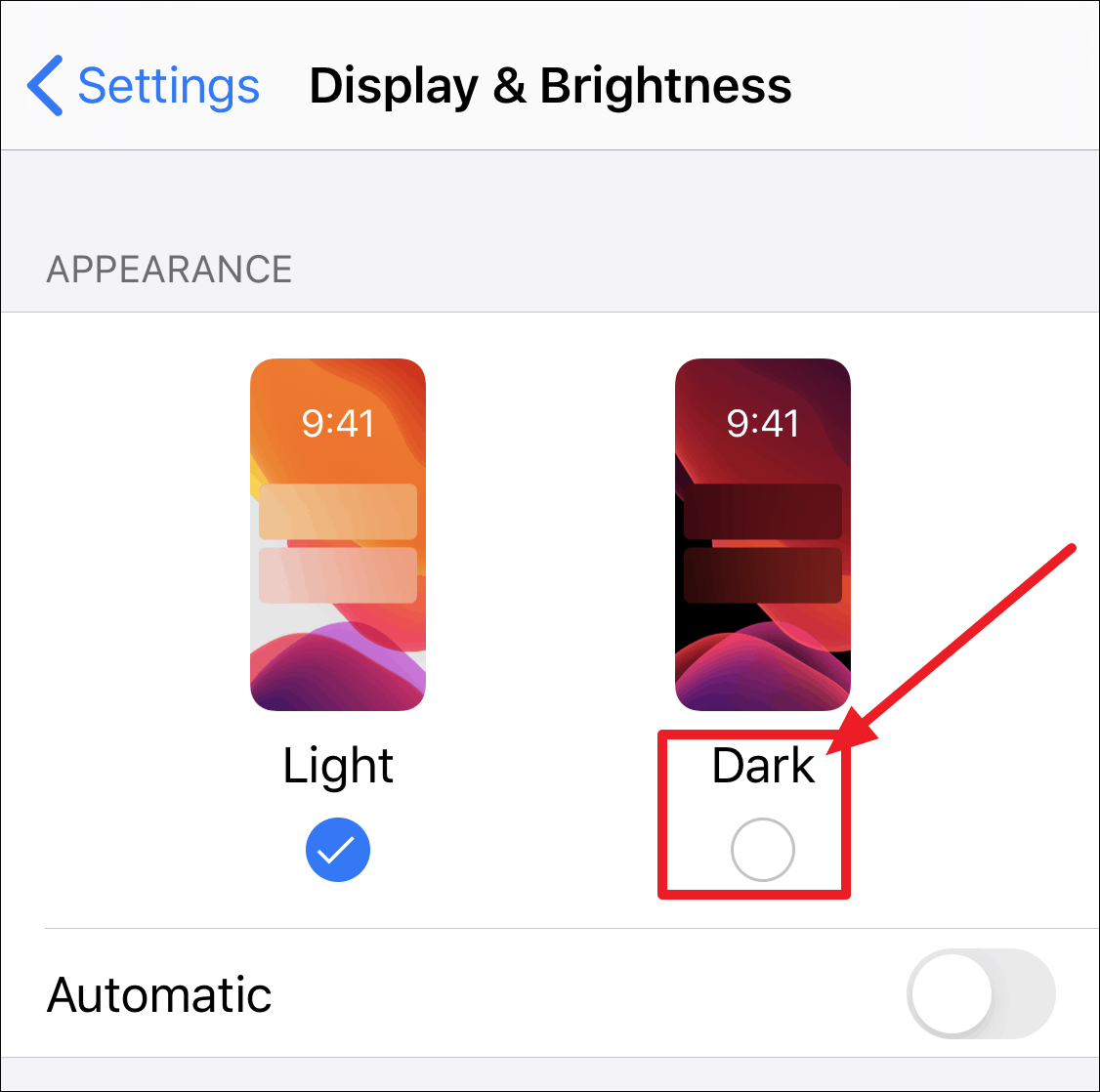In Settings, go to Display & Brightness, and turn on Dark Mode. You can also set the Dark Mode setting to be turned on automatically during a certain time of the day. Just turn the toggle on for Automatic under Appearance settings in Display & Brightness Settings.