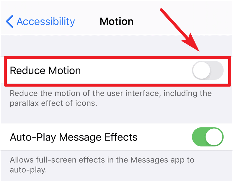 To disable the motion effects, go to Settings > Accessibility > Motion, then turn on the toggle for Reduce Motion.