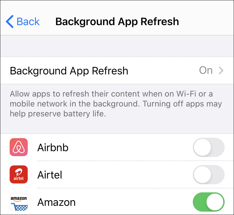 To review the apps using background refresh, go to Settings > General > Background App Refresh. All the apps using it will be listed. Turn the toggle off for apps that are not used regularly to preserve battery life.