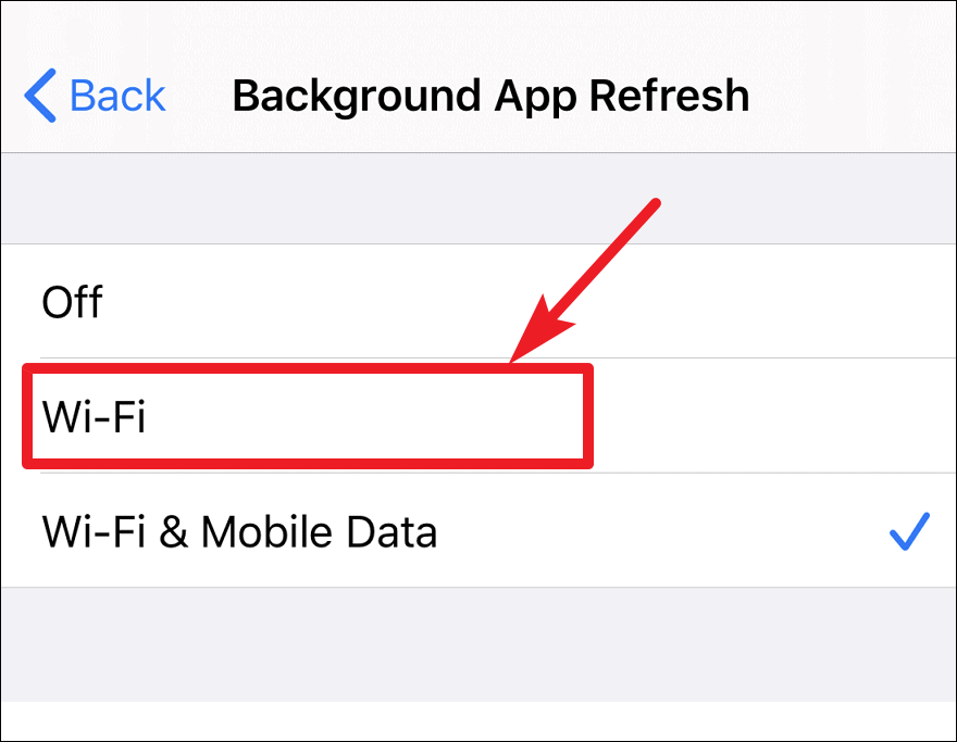 Another setting that you can change is to turn off the background app refresh altogether when your device is using Cellular Data. In the background app refresh settings, tap on the Background App Refresh option. The setting will be enabled for both Wi-Fi & Mobile Data. Change it to Wi-Fi only as Wi-Fi uses considerably less battery than cellular data.