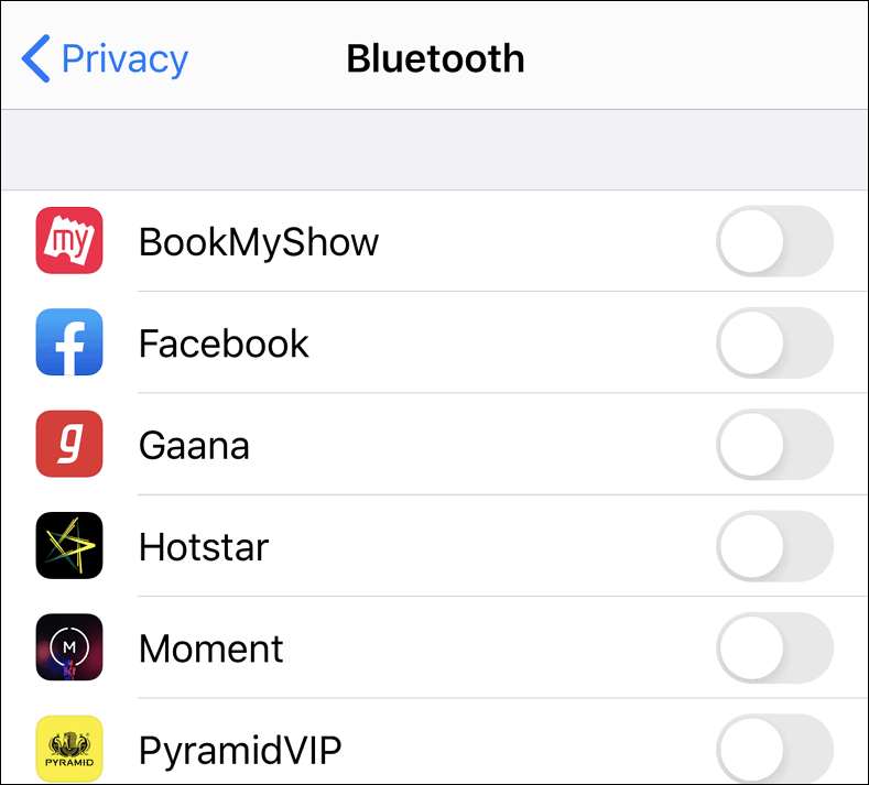To review the apps using Bluetooth, go to Settings > Privacy > Bluetooth. The apps accessing Bluetooth will be listed. Turn off the toggle for apps you want to deny access to. If for any app you find that it affects any functions, you can later turn it on.