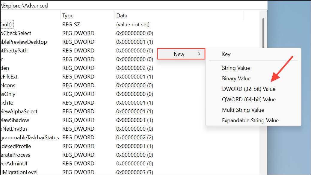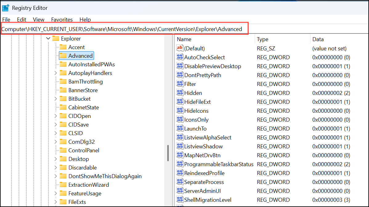 HKEY_CURRENT_USER\Software\Microsoft\Windows\CurrentVersion\Explorer\Advanced