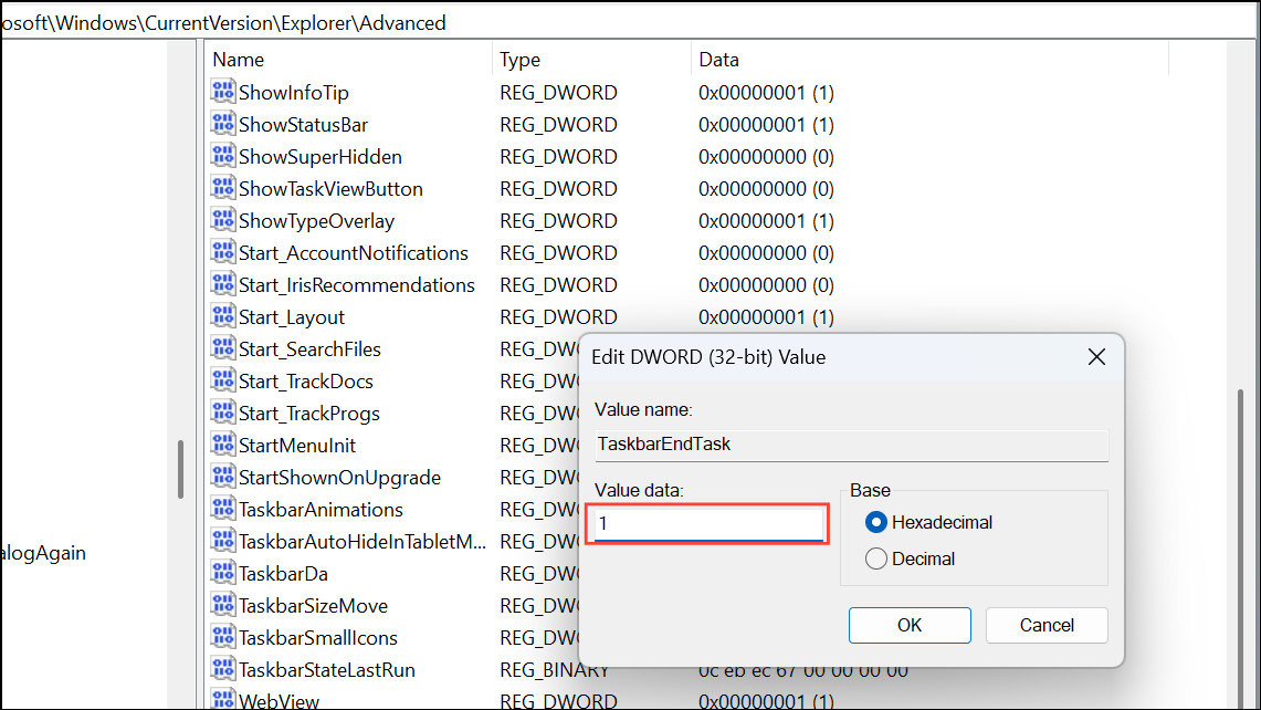 Step 4: Double-click on TaskbarEndTask, set its value data to 1, and click "OK".