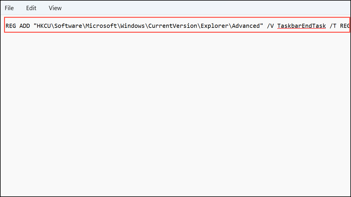 REG ADD "HKCU\Software\Microsoft\Windows\CurrentVersion\Explorer\Advanced" /V TaskbarEndTask /T REG_DWORD /D 1 /F