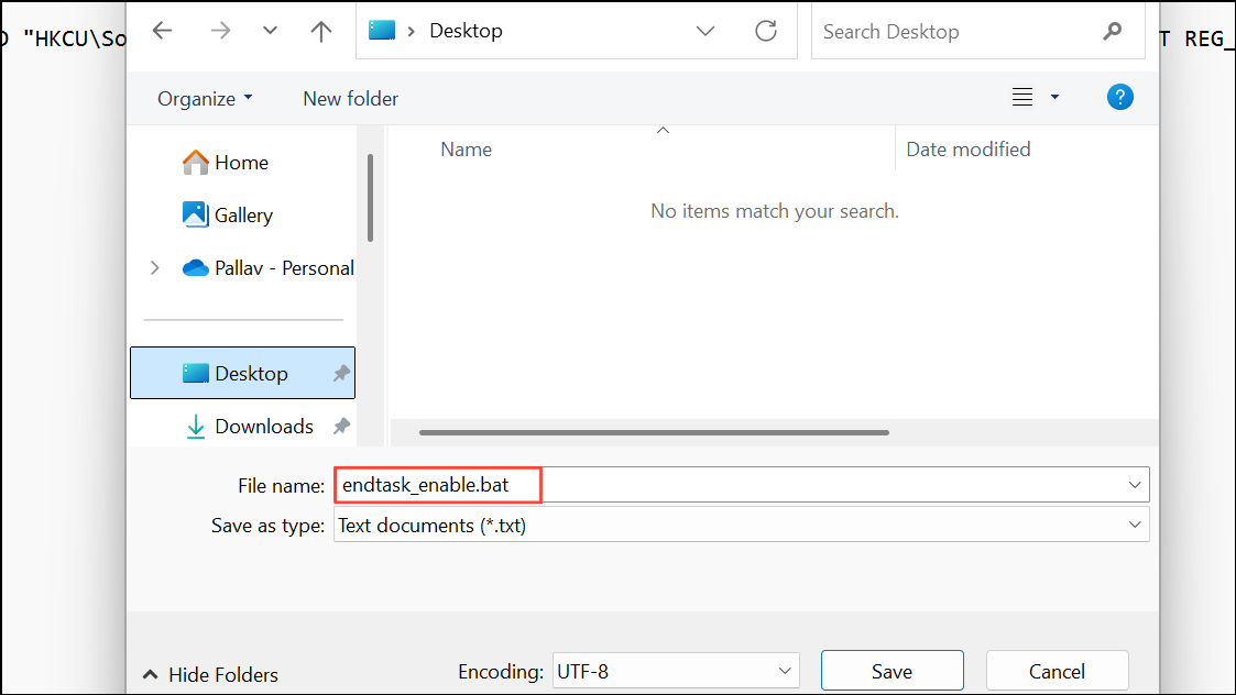 Step 2: Save the file with a .bat extension, for example, endtask_enable.bat.