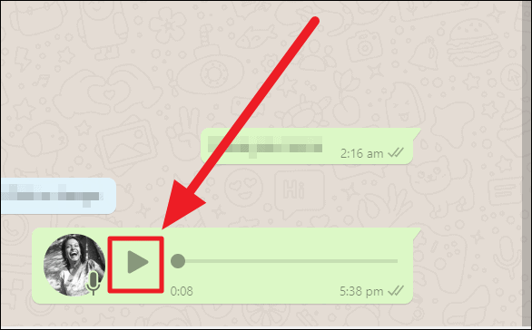 To get started, launch WhatsApp on your device and open a chat with a voice note. Hit the ‘Play’ button to play the message. You must first play the note to further change its speed.