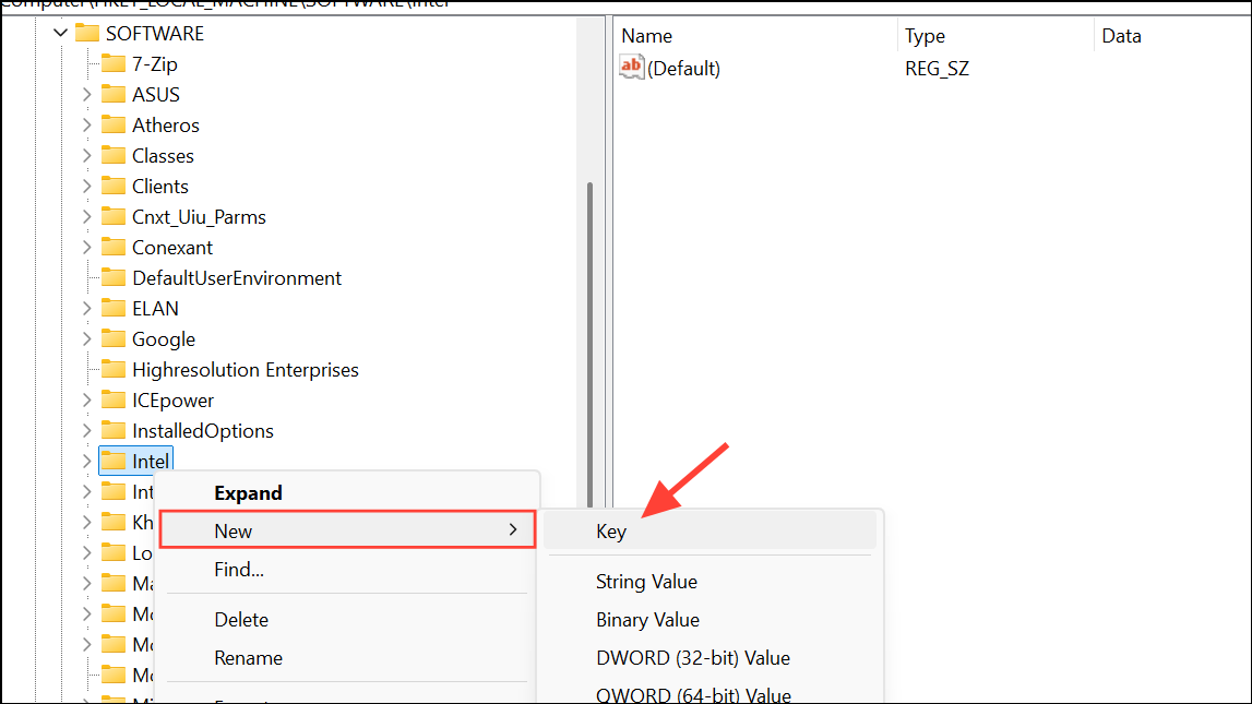 Step 3: Right-click the Intel folder, select New > Key, and name it GMM.
