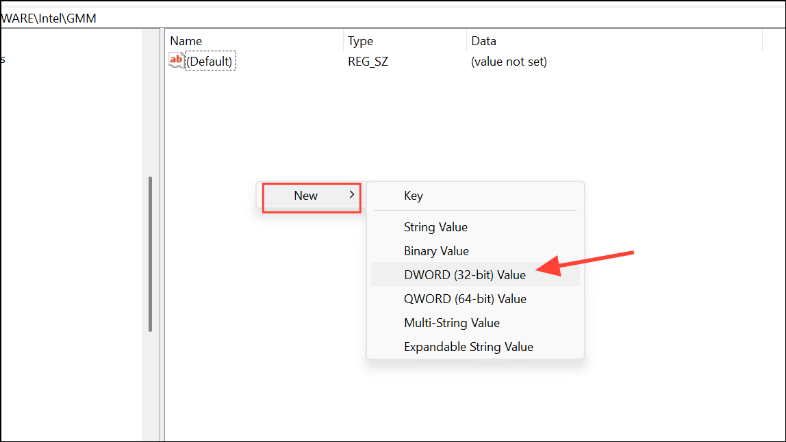 Step 4: Inside the GMM folder, right-click the blank area and select New > DWORD (32-bit) Value. Name this value DedicatedSegmentSize.