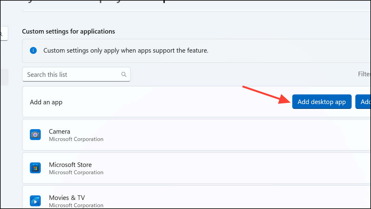 Step 3: Under Custom settings for applications, select the app or game you want to optimize, or click on Add desktop app and choose a program,