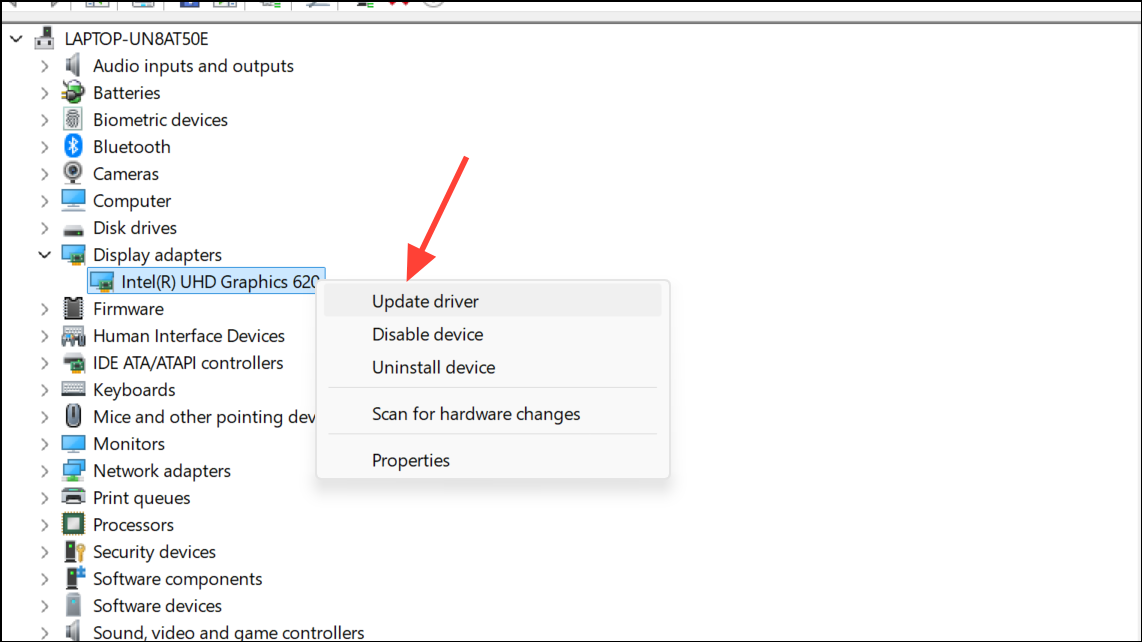 Step 2: Expand Display adapters, right-click your graphics device, and select Update driver.