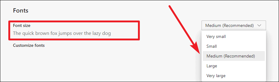 Step 4: For more precise adjustments, click on Customize fonts under the Font size setting.