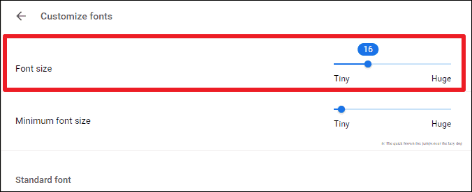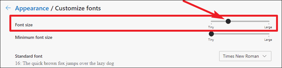 Step 5: In the Customize fonts section, use the slider under Font size to choose a specific text size between 9 and 72. Additionally, you can set a Minimum font size to ensure that text doesn't become too small on any webpage.