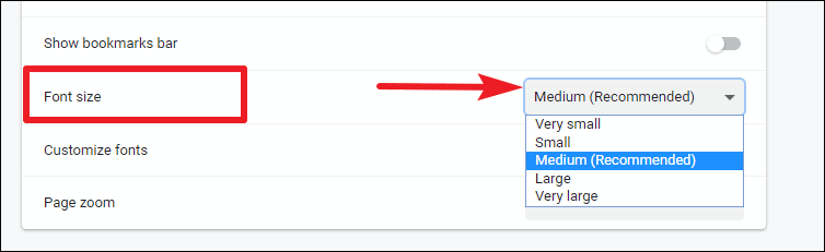 Step 3: Find the Font size option, which is set to Medium by default. Click the dropdown menu next to it and select your preferred text size from the options: Very small, Small, Medium, Large, or Very large.