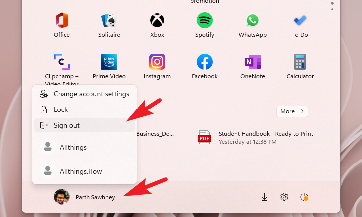 Step 6: To apply the new scaling factor, you'll need to sign out and sign back in. Open the Start Menu, click on your account picture or initials, and select Sign out.