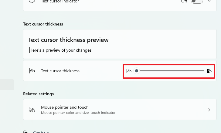 Step 4: To increase the cursor's thickness, find the 'Text cursor thickness' section and move the slider to the right. You'll see a preview of the cursor thickness in the example text.