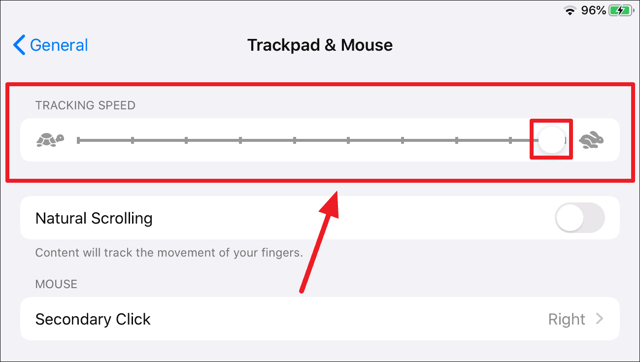 On the ‘Trackpad & Mouse’ setting screen, move the slider for ‘Tracking Speed’ to the highest level to significantly increase the mouse speed on the iPad.
