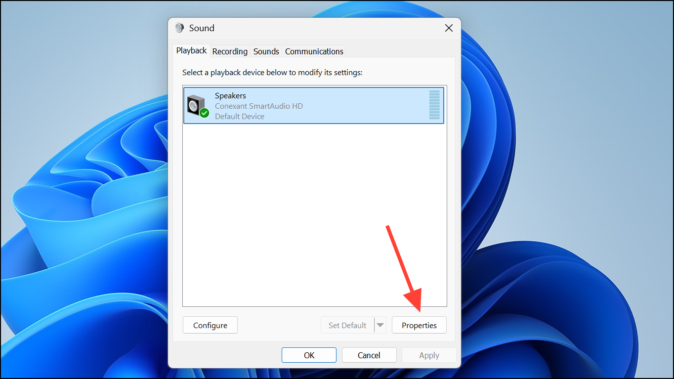 Step 2: Under the Playback tab, select your active playback device (such as Speakers or Headphones) and click Properties.
