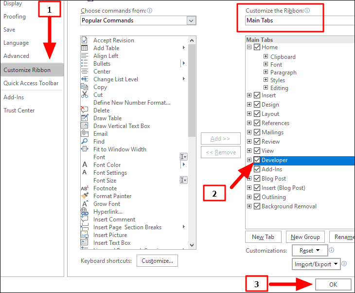 Step 3: In the Word Options dialog box, click on Customize Ribbon on the left side. Under the Customize the Ribbon section on the right, ensure that Main Tabs is selected in the dropdown menu. Scroll through the list of tabs, find Developer, and check the box next to it. Then, click OK at the bottom to save your changes.