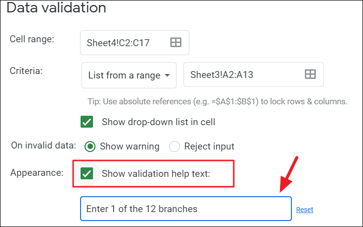 Step 8: Decide how to handle invalid data entries under On invalid data. Choose Show warning to accept the input with a warning, or Reject input to prevent any entries not on the list.