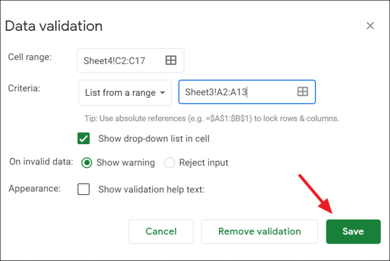 Step 4: Click Save to confirm and remove the drop-down list from the selected cells.