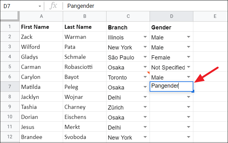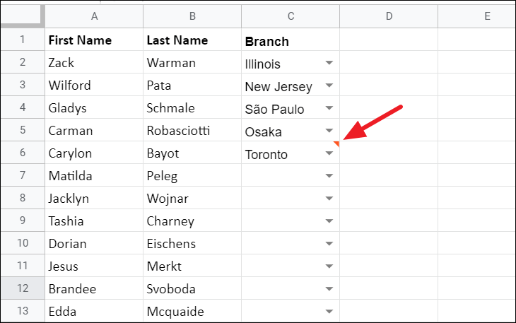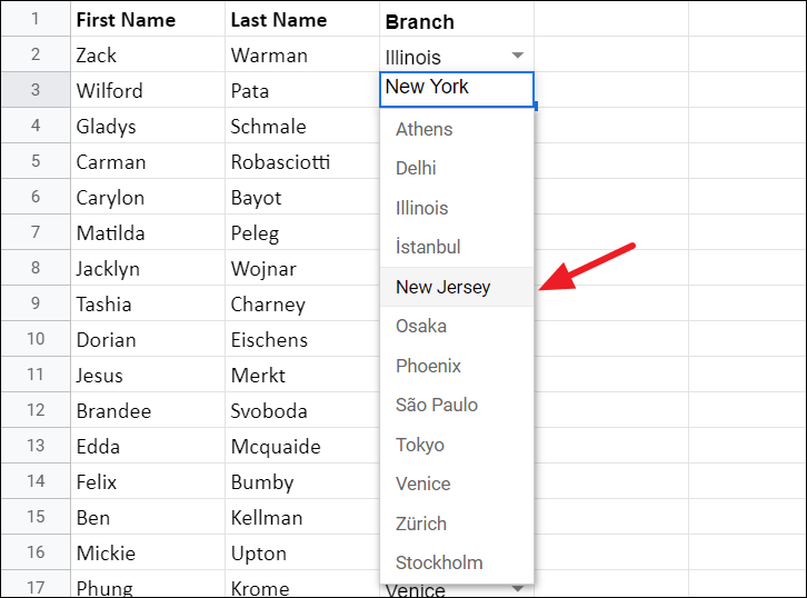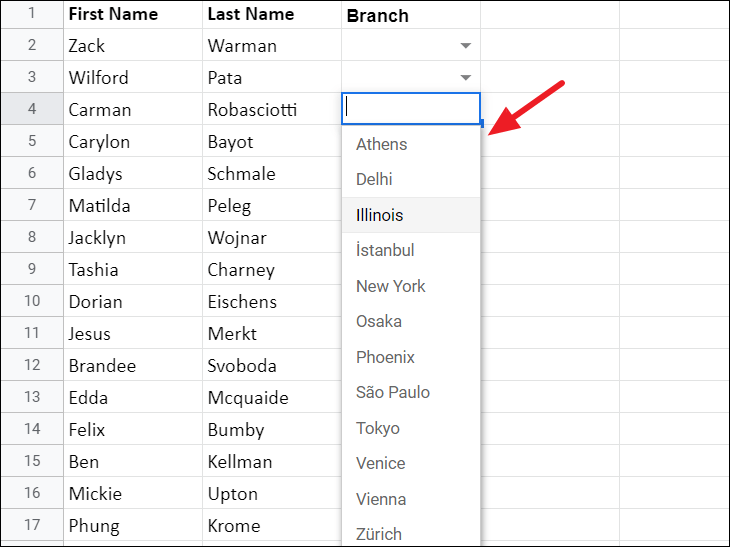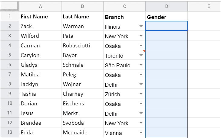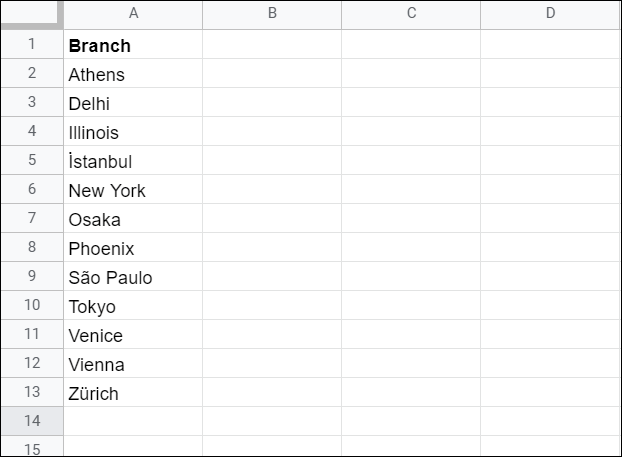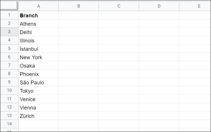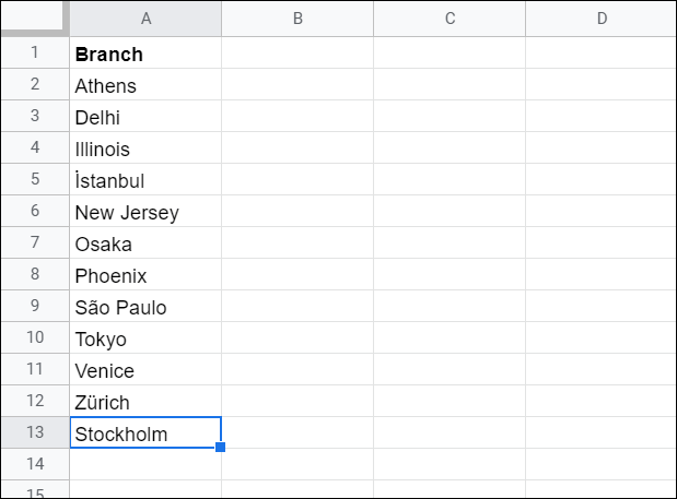 Step 1: Open your Google Sheets document and enter the list of items you want to include in your drop-down menu. In this example, we've listed city names as branch locations.