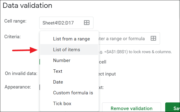 Step 3: Ensure the correct cell range is specified. In the Criteria section, select List of items from the drop-down menu.