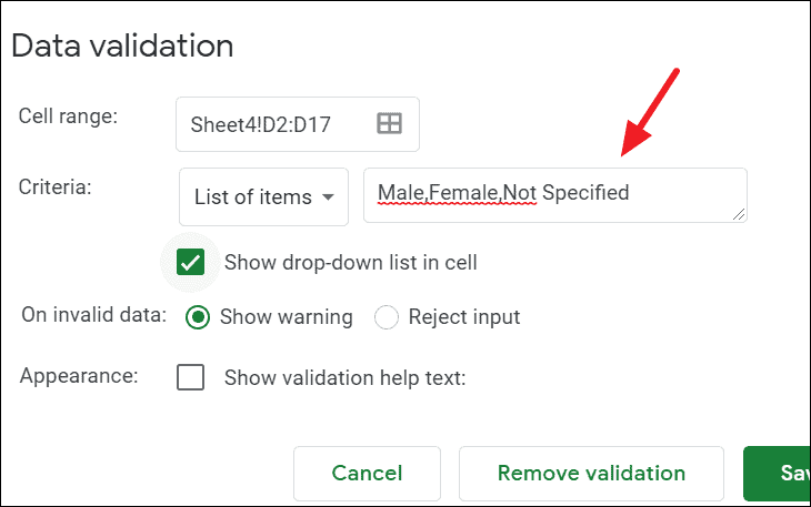 Step 5: Check the Show dropdown list in cell option. Under On invalid data, select Reject input to prevent users from entering values outside your specified items.