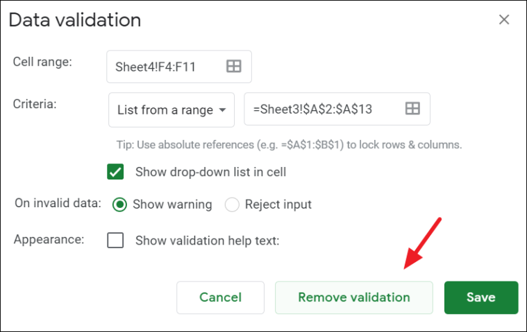 Step 3: In the Data validation dialog box, click on the Remove validation button at the bottom.