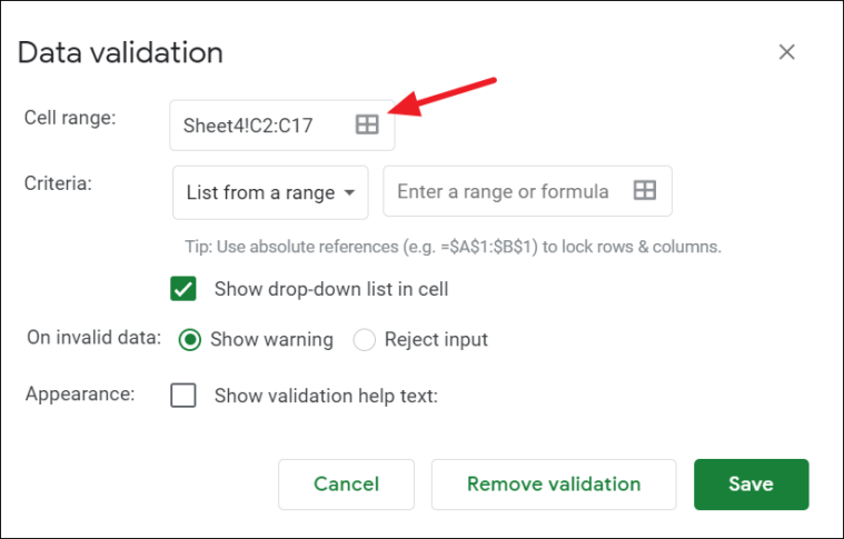 The Cell range field will display the cells you've selected for the drop-down list. You can adjust this by clicking the grid icon and selecting a different range if needed.