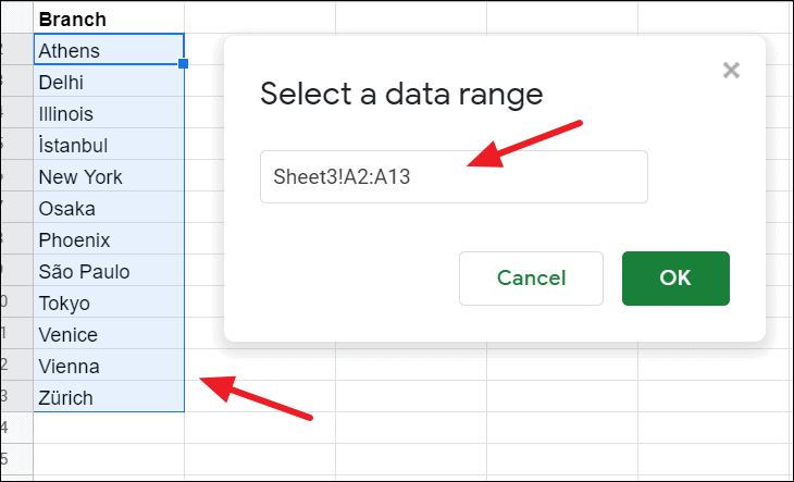 Step 6: In the Select a data range dialog, choose the cells with your list items. The selected range will appear in the field. Click OK to confirm.