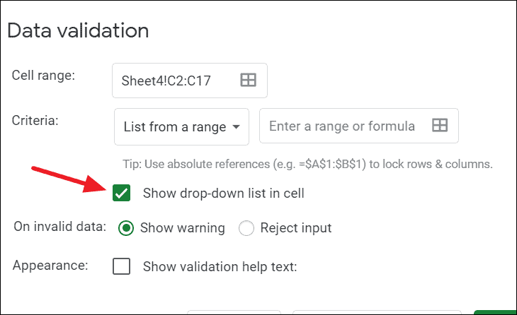 Step 7: Ensure that the Show dropdown list in cell option is checked. This displays the drop-down arrow in the cell for users to access the list.