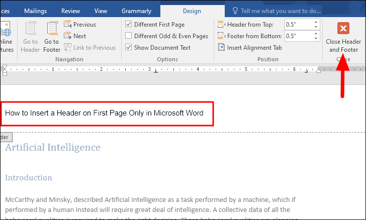 Step 3: Enter the header content that you want to display only on the first page, such as the document title or author's name. When you're finished, click on Close Header and Footer in the Design tab to exit the header editing mode and return to your document.