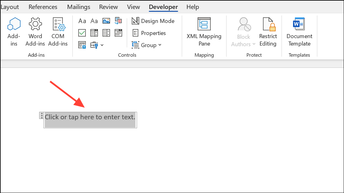 Step 4: Click either the Rich Text Content Control or Plain Text Content Control button. The selected control will be inserted at your cursor’s position, displaying a placeholder that users can click to enter information.