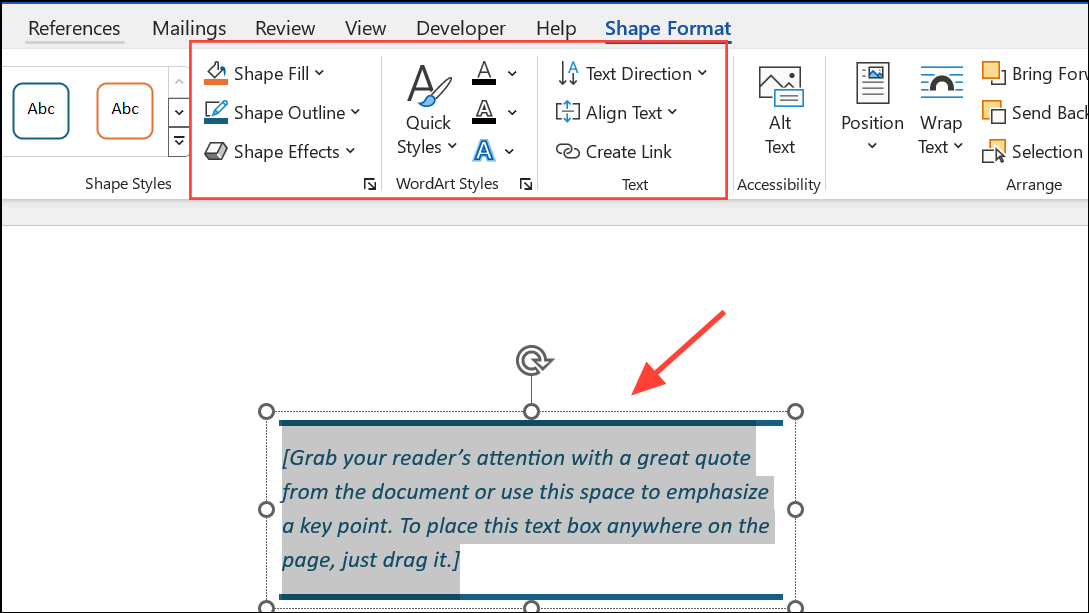 Step 2: Click inside the text box and type or paste your text. The box can be repositioned by dragging its border, and formatting can be applied both to the text inside and the box itself using the Shape Format tab.