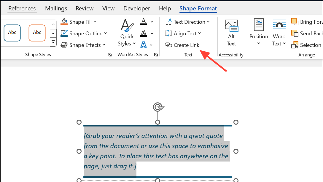 Step 3: For advanced layouts, link multiple text boxes so text flows from one to another. Select a text box, go to Shape Format, and click Create Link in the Text group. Then click another empty text box to connect them.