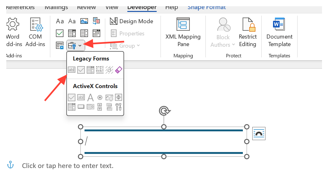 Step 2: Place your cursor where you want the field. On the Developer tab, click Legacy Tools in the Controls group. Under Legacy Forms, select the Text Form Field button (usually depicted as ab|).